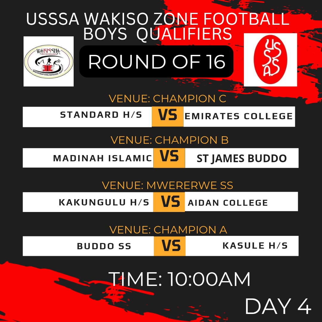In the 10am Fixtures, STAHIZA take on Emirates at Champions playground C, Maddina play St Jameson Champions B and Kakungulu High play Aidan College at Mwererwe SS.